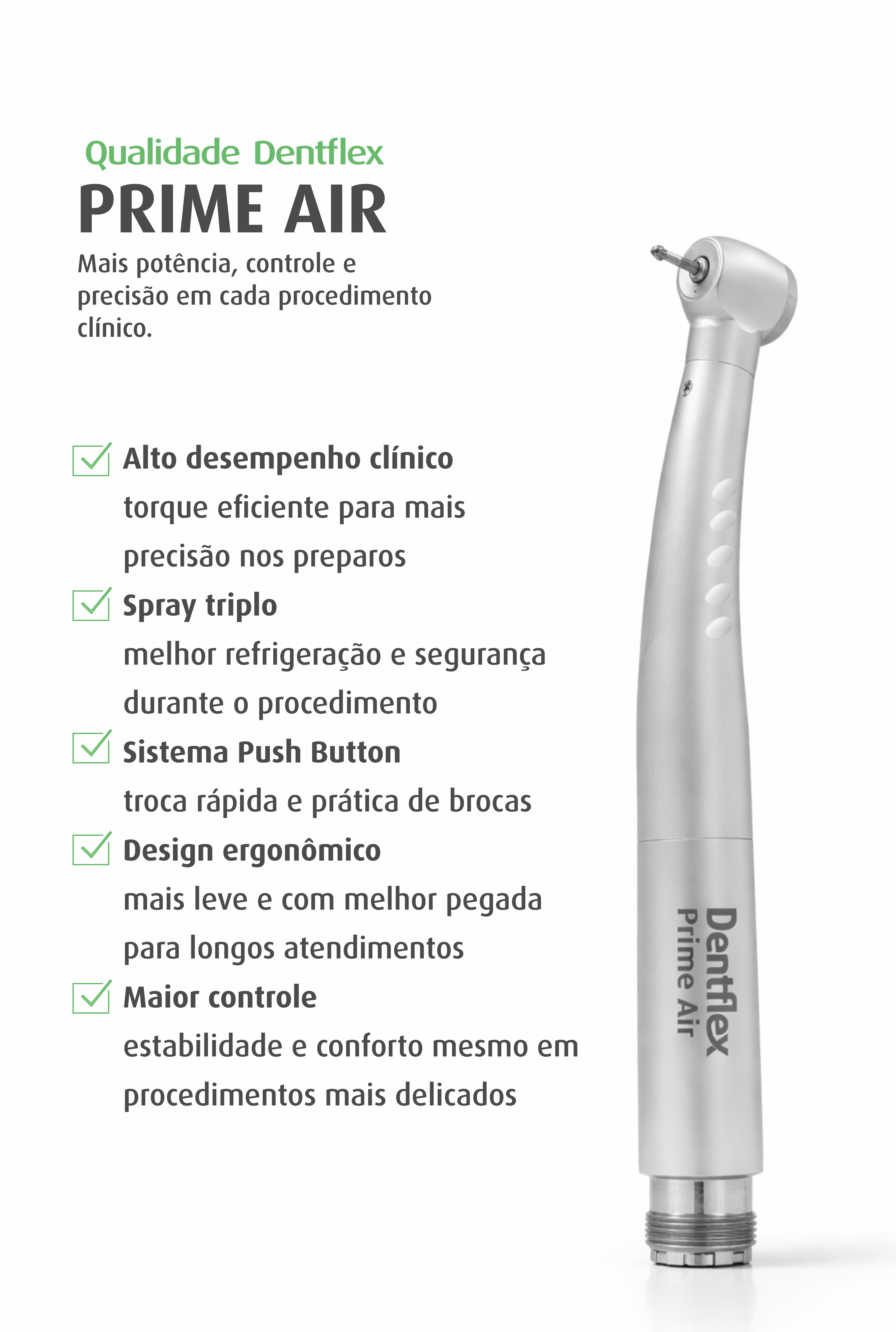 A Prime Air é a caneta de alta rotação odontológica ideal para o dentista que busca precisão, conforto e durabilidade em cada procedimento. Desenvolvida com a qualidade da Dentflex, ela entrega desempenho consistente, excelente refrigeração e fácil esterilização, garantindo segurança clínica e produtividade no consultório.